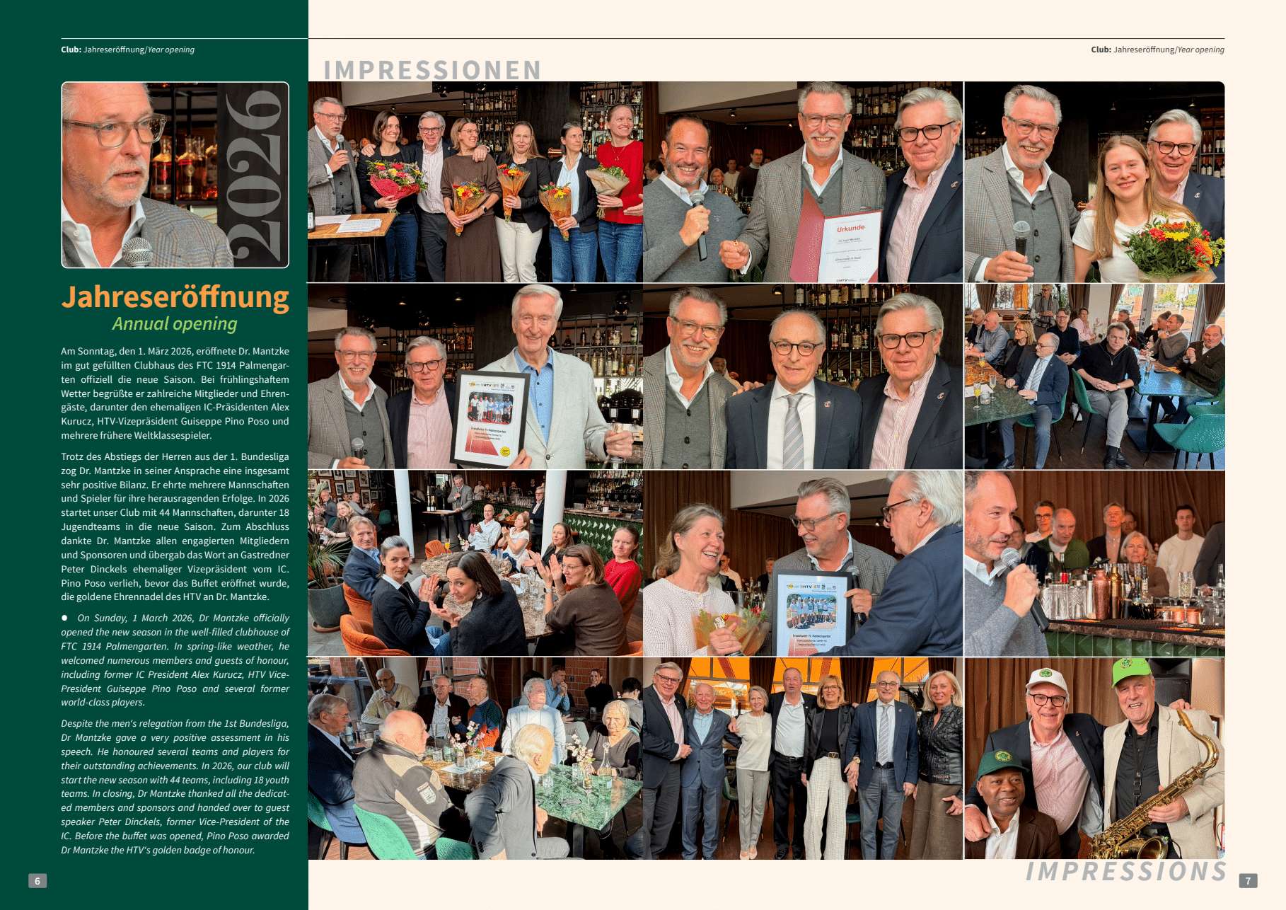Bei frühlingshaftem Wetter begrüßte er zahlreiche Mitglieder und Ehrengäste, darunter den ehemaligen IC-Präsidenten Alex Kurucz, HTV-Vizepräsident Guiseppe Pino Poso und mehrere frühere Weltklassespieler. Trotz des Abstiegs der Herren aus der 1. Bundesliga zog Dr. Mantzke in seiner Ansprache eine insgesamt sehr positive Bilanz. Er ehrte mehrere Mannschaften und Spieler für ihre herausragenden Erfolge. In 2026 startet unser Club mit 44 Mannschaften, darunter 18 Jugendteams in die neue Saison. Zum Abschluss dankte Dr. Mantzke allen engagierten Mitgliedern und Sponsoren und übergab das Wort an Gastredner Peter Dinckels ehemaliger Vizepräsident vom IC. Pino Poso verlieh, bevor das Buffet eröffnet wurde, die goldene Ehrennadel des HTV an Dr. Mantzke.