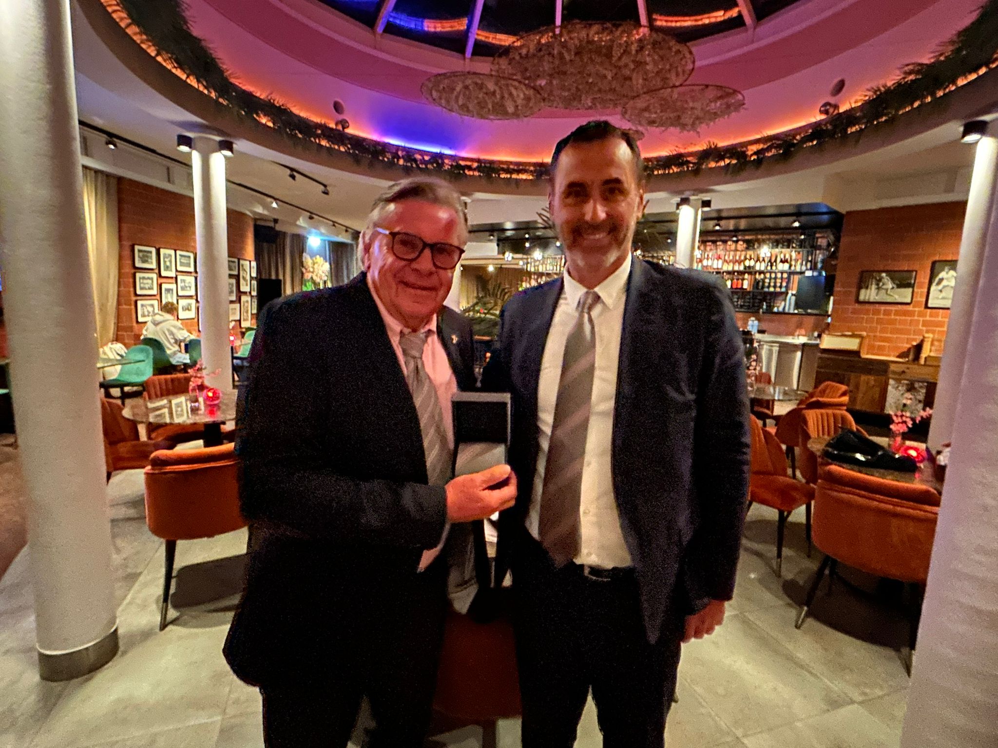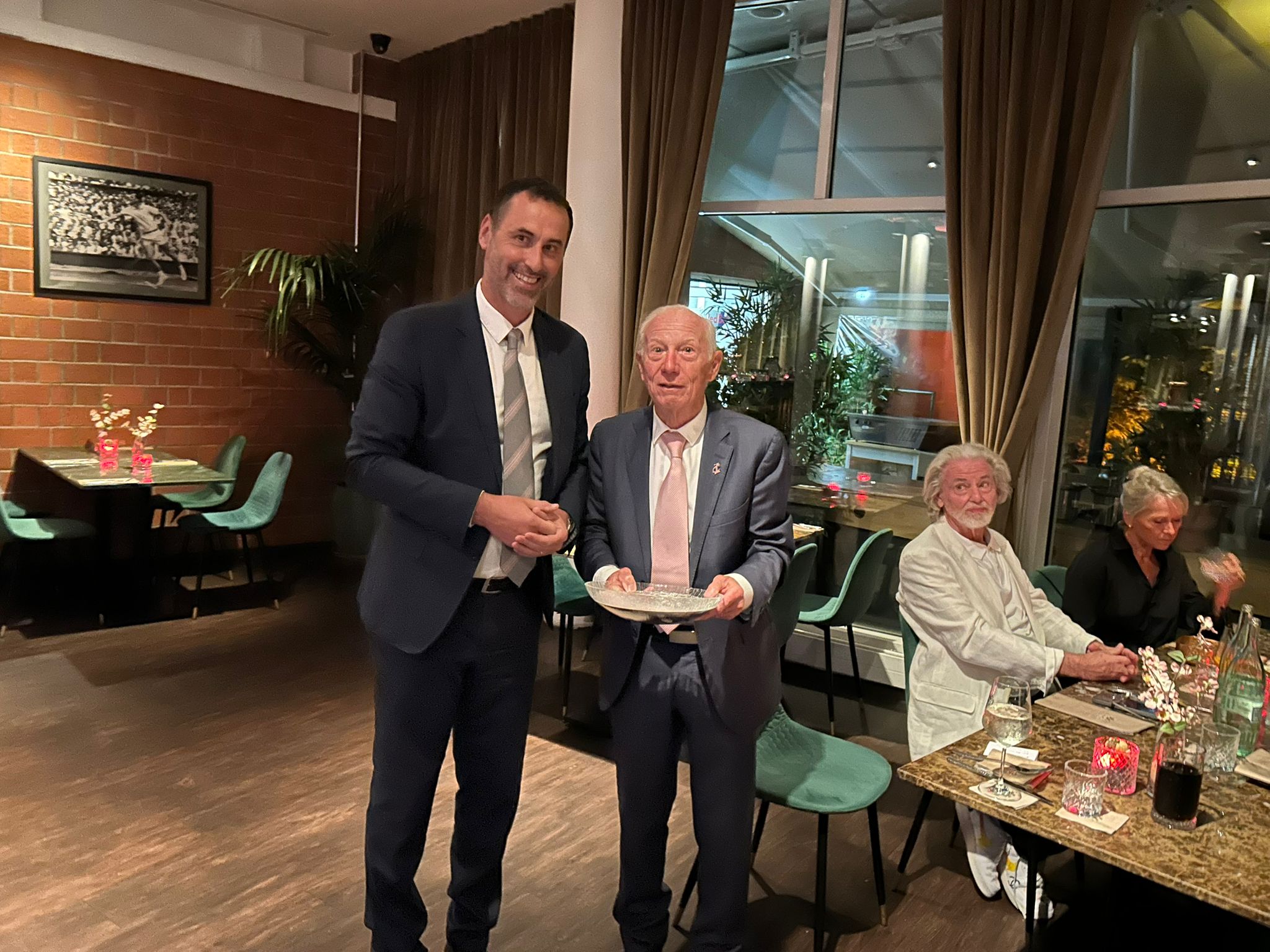 Wie in Freundschaftsspielen üblich wurden beim IC Dinner IC-Krawatte und IC-Tuch verteilt. Bei den Herren wurde Jürgen Hackauff bedacht – als Dank für sein unermüdliches Engagement für den IC. Unser deutsches Tuch wurde an Nanette Duxin übergeben.